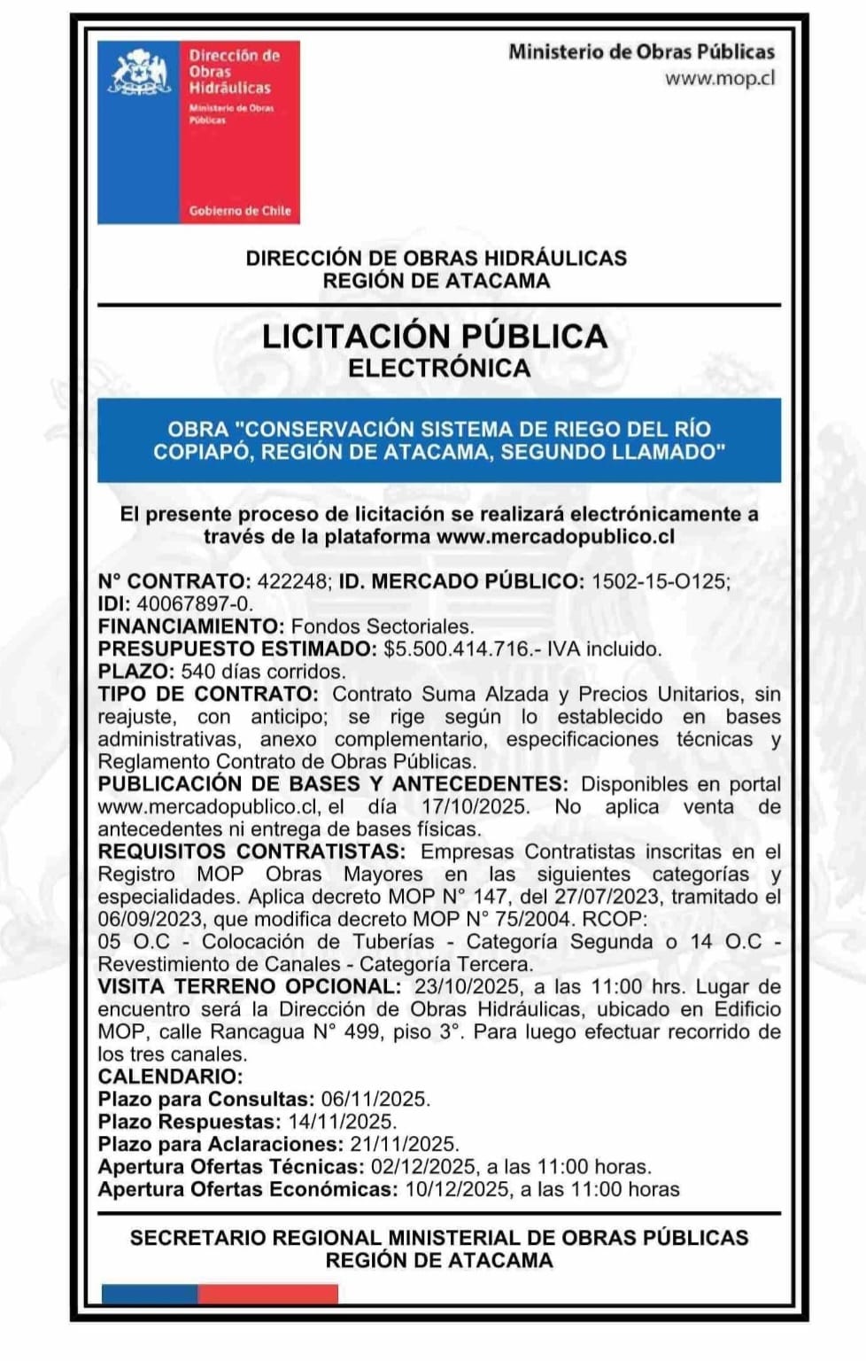 AVISO LICITACIONES: DIRECCIÓN DE OBRAS HIDRÁULICAS REGIÓN DE ATACAMA